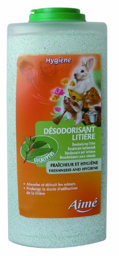Le désodorisant pour litière Aimé libère progressivement une senteur fraïche et prolonge la durée d'utilisation de la litière. Parfum eucalyptus. 700ml.
