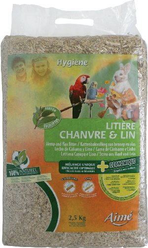 Destinée aux petits mammifères et aux oiseaux, la litière 100% naturelle Chanvre & Lin Aimé est constituée de chanvre et de lin cultivés sans aucune utilisation de produits chimiques. Très absorbante (1kg peut absorber jusqu'à 4,3l de liquide), elle est aussi efficace dans la rétention des odeurs. Cette litière est dépoussiérée, saine pour l'animal et biodégradable. Elle ne colle pas aux pattes. Parfum eucalyptus. Jusqu'à 2 mois de litière avec ce paquet de 2,5kg.