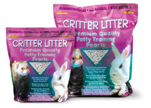 " Critter Litter is a a new premium-quality potty training pear for spot training ferrets, rabbits, pet rats and other small animals. It is specially formulated to be 99% dust-free and super absorbent and is made from all natural non-toxic minerals. Critter Litter absorbs moisture on contact and inhibits the bacteria that cause pet waste odors. In combination with a potty training program, Critter Litter will reduce cage cleaning by 30% or more!"